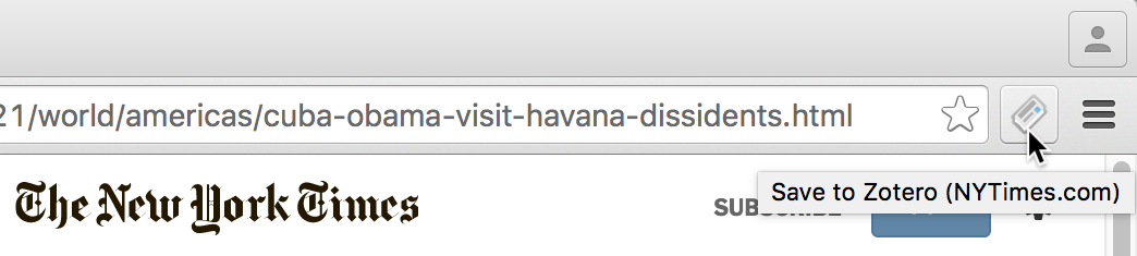 After installing the Connector a Zotero button will be added to your browser. Clicking the button will save the currently open website into your Zotero library. The saving workflow has three steps: