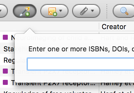 Zotero can add items automatically using their an ISBN number, Digital Object Identifier (DOI), or PubMed ID. This is done by clicking the Add Item by Identifier button () in the Zotero toolbar, typing in the ID number, and clicking OK. You can even paste or enter (press Shift+Enter for a larger box) a list of such identifiers at once.