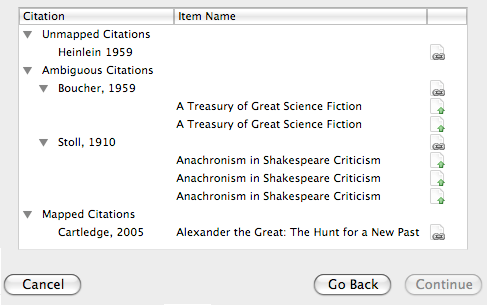 The Verify Cited Items screen will tell you which citations were mapped properly and which remain ambiguous. To fix an improperly mapped citation, click the icon to its right and select the correct citation in the dialog that appears. Zotero will provide suggestions for citations it is unsure of. Clicking the icon with the green arrow to the right of the suggestion will map it to that citation. Once all the citations are mapped properly, you can click Continue.